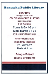 Do you have a favorite hobby, activity, talent, or special information that you would like to share with the community? The Kanawha Public Library would love to host a gathering for you to share your interest. Stop in or contact us on facebook or Homebound Library Service We are pleased to announce that we are offering a homebound delivery service within the city limits of Kanawha including residents of the care center. Please call the library if you or someone you know would like us to bring the library to them: 641-762-3595.