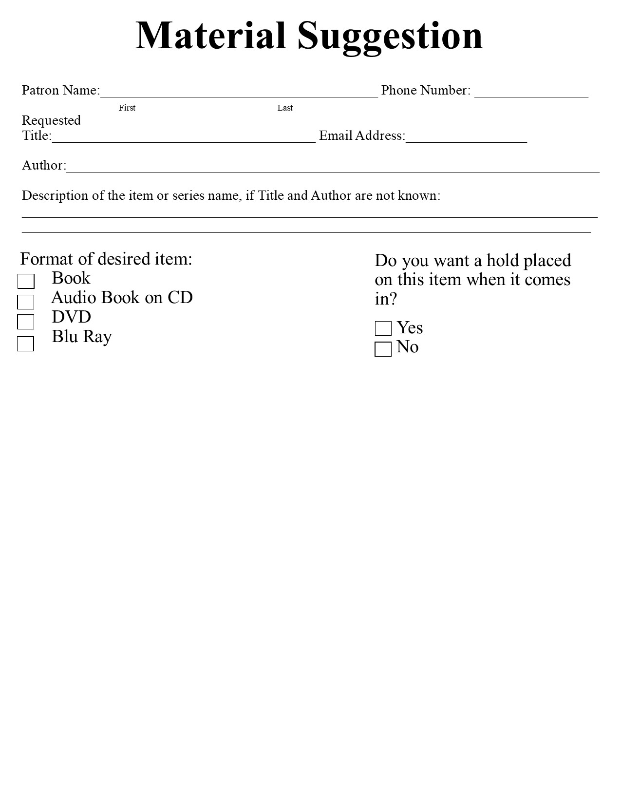 Click on the form below, print it and bring it to the Library to suggest material to add to our collection!