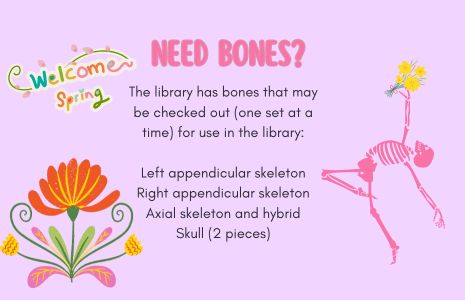 Need bones? The library has bones that may be checked out (one set at a time) for use in the library:  Left appendicular skeleton, Right appendicular skeleton, Axial skeleton & Hyoid, Skull (2 pieces).
