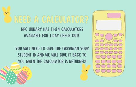 Need a calculator? NPC Library has TI-84 Calculators available for 1 DAY check out! You will need to give the librarian your student ID, and we will give it back to you when the calculator is returned!