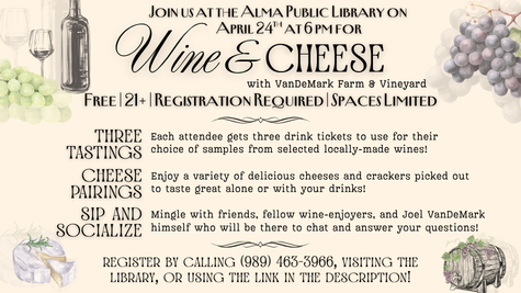 Join us for a special Wine and Cheese Party at the Alma Public Library on Friday, April 24th, at 6 PM!