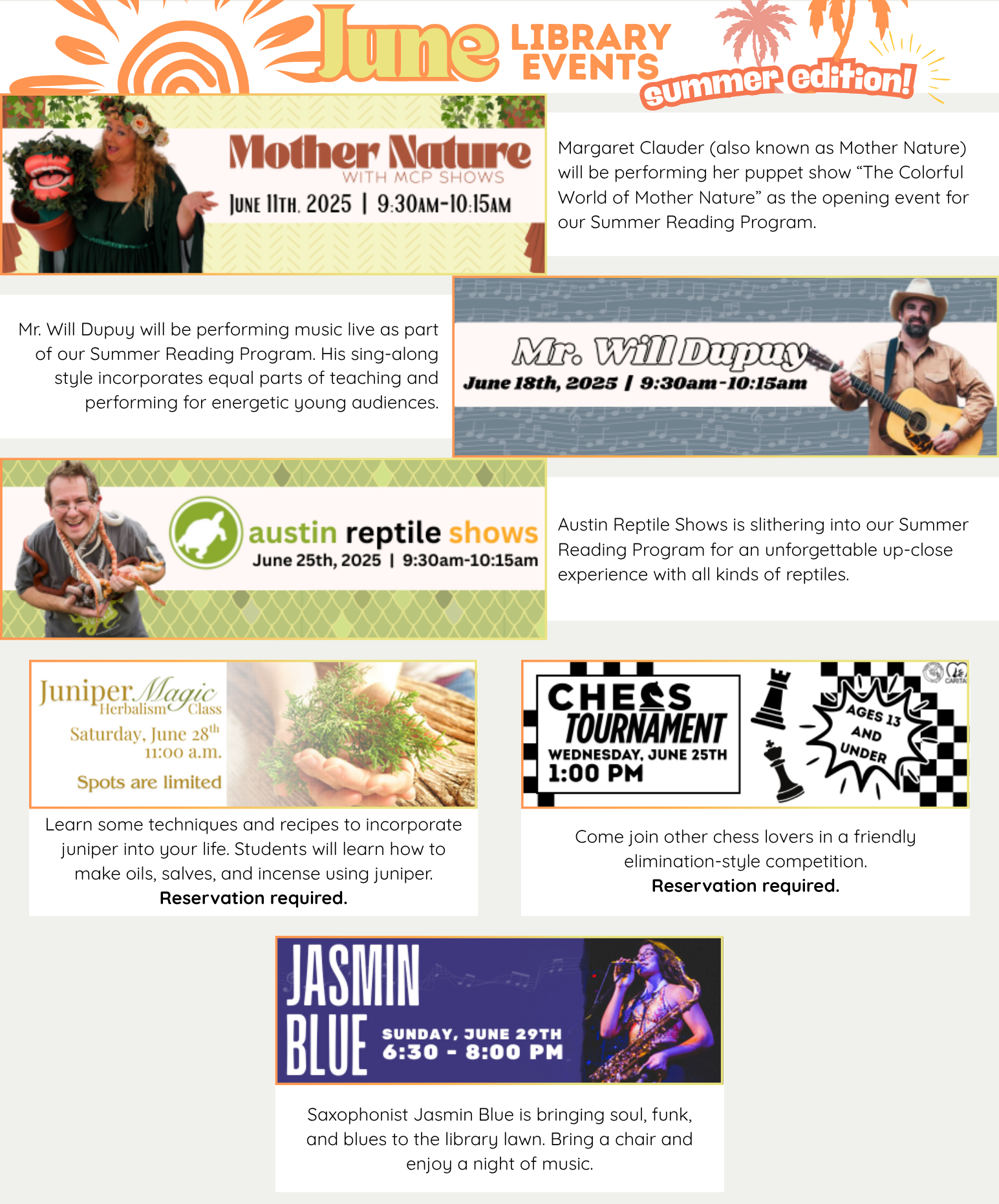 Annual Summer Reading event at library. Coming 2026!