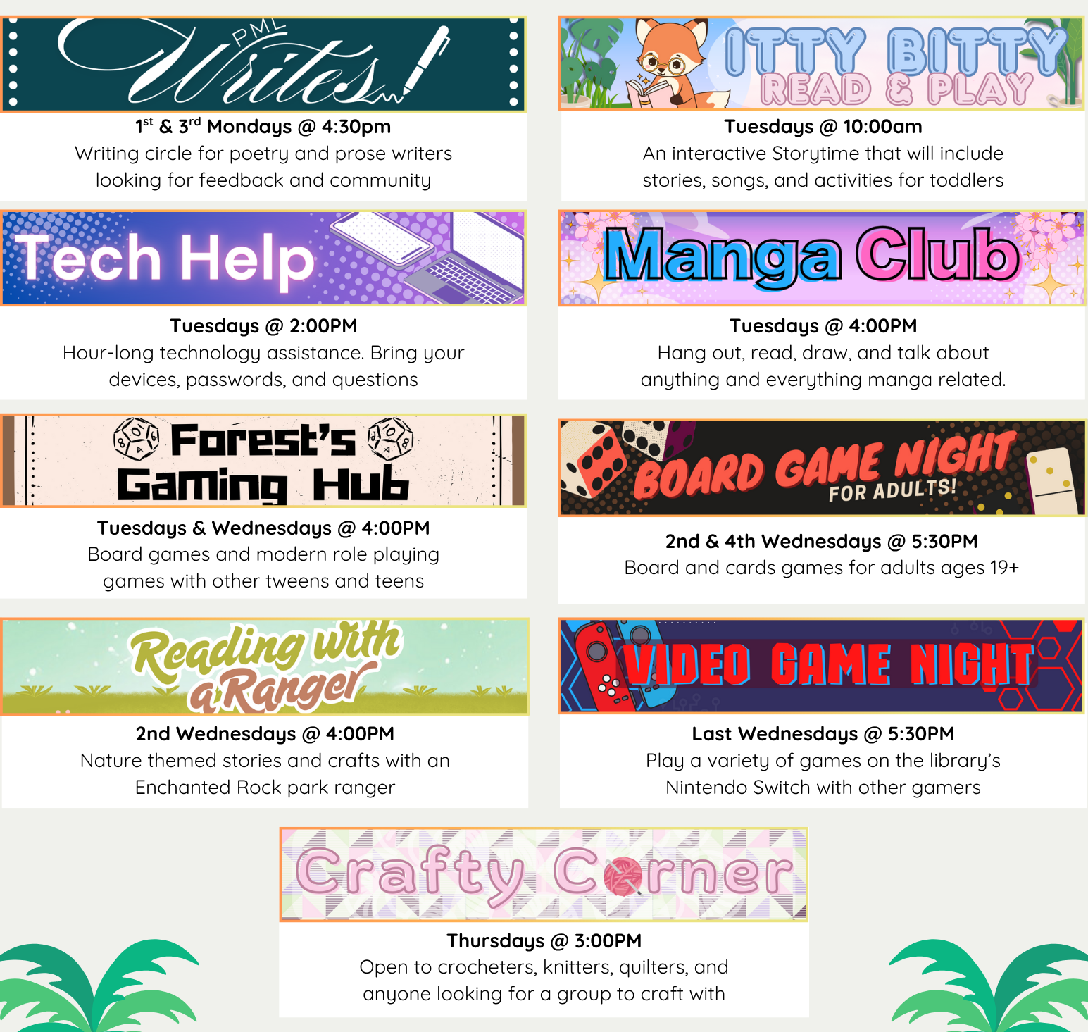 Tween/Teen gaming hub. Play TTRPG such as D&D. Contact the library for more information.